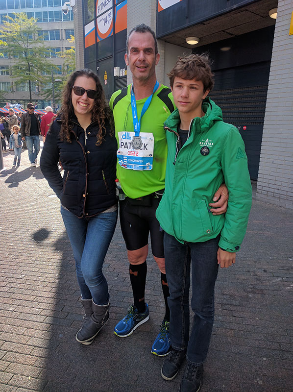 De marathon zelf heb ik echt in een soort tunnel gelopen. Alleen met mezelf bezig geweest. Vooraf plan gemaakt, wanneer drinken, wanneer eten, welk tempo, continue kijken op horloge voor hartslag etc. Gekozen om met de hazen van 3:45 mee te lopen. Met een pr van 1:34 op de halve marathon was dat ook wel een realistisch streven. Het ging ook heel lang goed, tot km 30, daar kreeg ik een soort kramp in mijn hamstring. Meteen gekozen om langzamer te gaan lopen om zeker te zijn dat ik zo finishen. Had al in de gaten dat onder de 4 uur gewoon haalbaar was. Het ging gelukkig goed en wandelen bij de waterposten was een uitkomst. Na 3:54:09 kwam ik over de streep en was het lopen van een marathon waarheid geworden en had ik sommigen een poepje laten ruiken. Een traantje van geluk werd weggepinkt en het was ontzettend leuk dat mijn gezin er was. Wat was ik moe. Tsjee, hakt er wel in deze afstand. Maar al snel kwam de trots en voldoening. Jaren trainen en vooral veel discipline hadden mij tot dit punt gebracht. Al snel kwam het plan er 3 te gaan lopen, waarbij de 3e die van New York zou moeten worden.